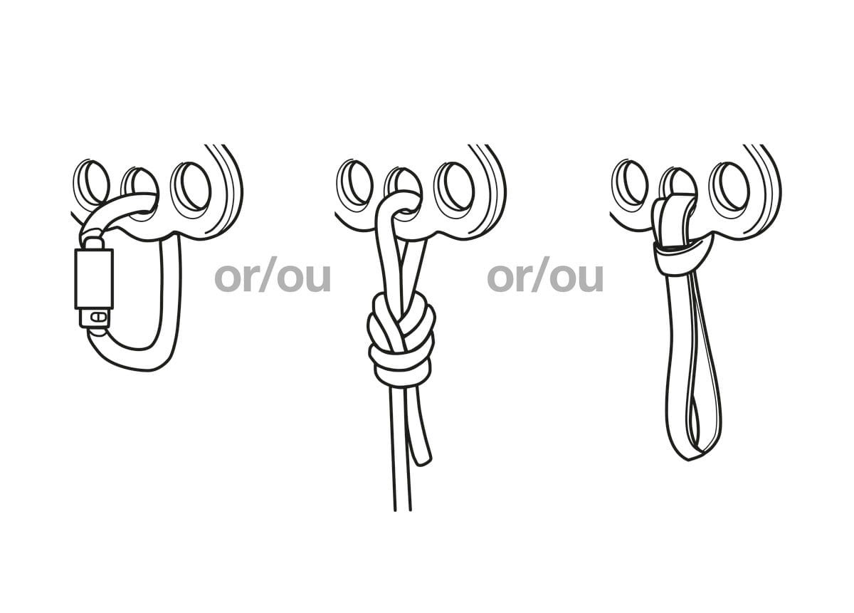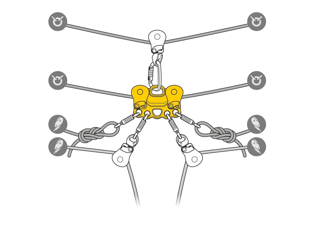 - Możliwość zdublowania systemu przy użyciu dwóch bloczków REEVE, gdy liny są blisko siebie lub wpięcie bloczka do górnego otworu, jeśli liny są bardziej oddalone.