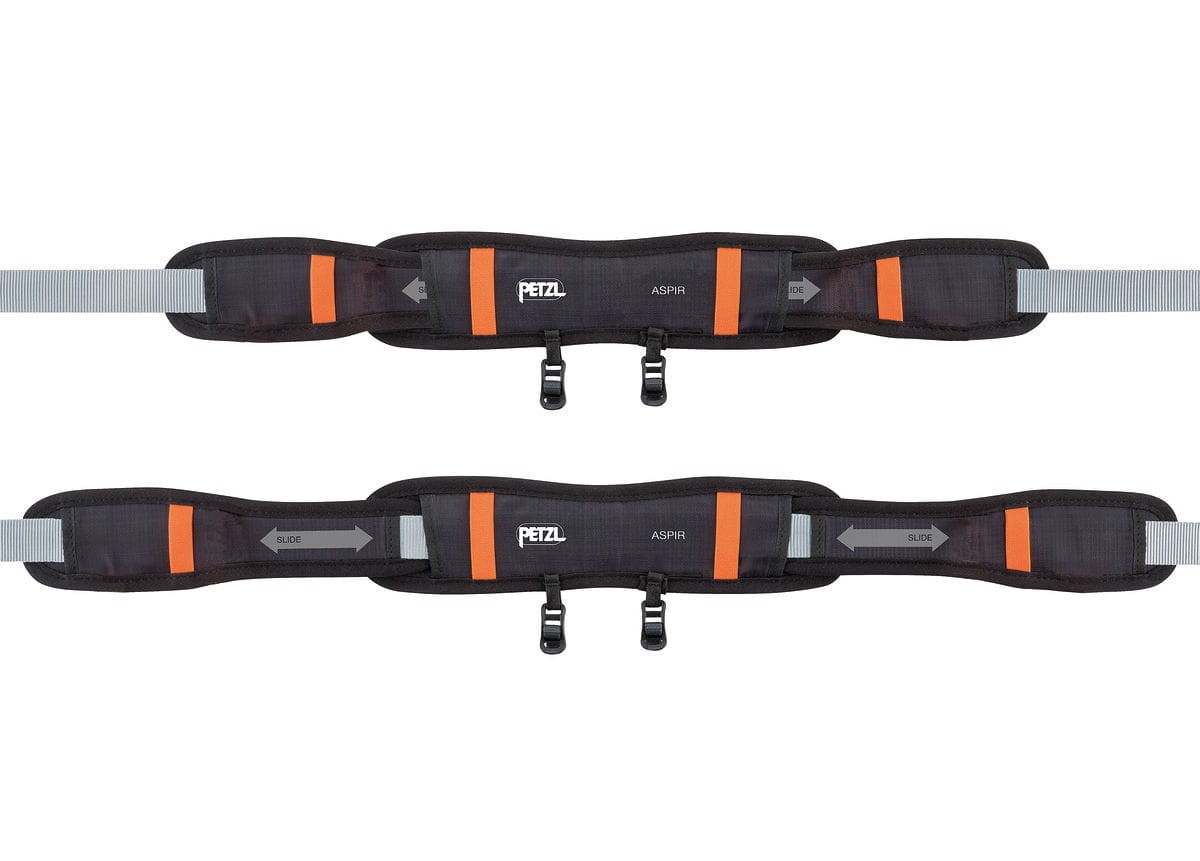 - Regulowany pas z przesuwającą się wyściółką (patent Petzl), co ułatwia dopasowanie po założeniu uprzęży.