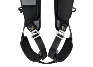 - Automatyczne klamry FAST LT na taśmach udowych umożliwiają szybkie założenie uprzęży bez unoszenia nóg, co eliminuje potrzebę ponownej regulacji.