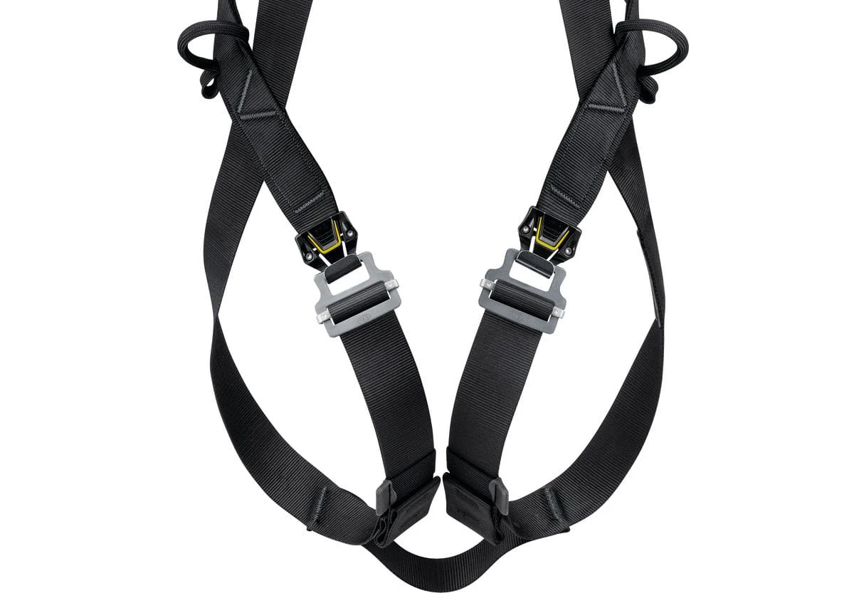 - Klamry automatyczne FAST LT na taśmach udowych umożliwiają szybkie założenie uprzęży bez konieczności unoszenia nóg, co eliminuje potrzebę ponownej regulacji przy każdym użyciu.